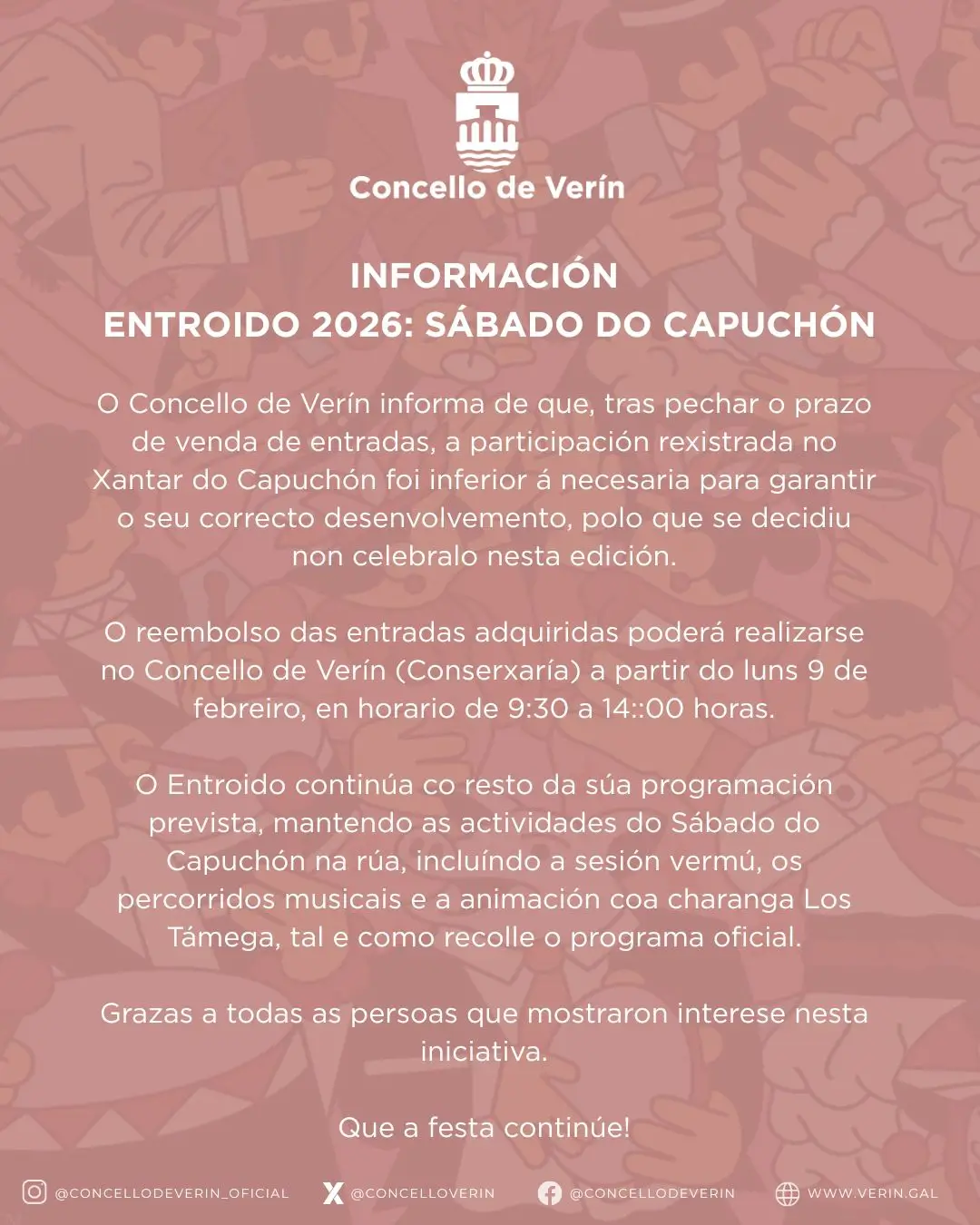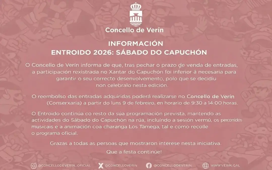 💶 👉 O reembolso das entradas adquiridas poderá realizarse no Concello de Verín (Conserxaría) a partir do luns 9 de febreiro, en horario de 9:30 a 14:00 horas.
