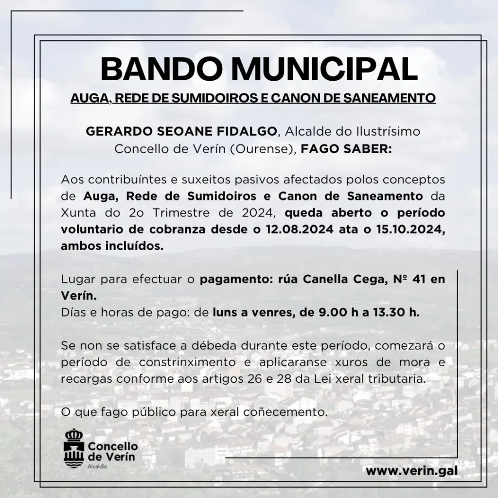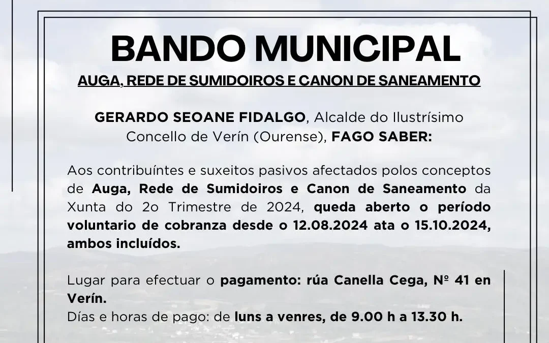Verín, 8 de agosto de 2024. O Concello de Verín comunica aos contribuíntes e suxeitos pasivos afectados polos conceptos de Auga, Rede de Sumidoiros e Canon de Saneamento que se abre o período voluntario de cobranza correspondente ó 2º Trimestre de 2024. Este período estará en vigor desde o 12 de agosto de 2024 ata o 15 de outubro de 2024, ambos incluídos.