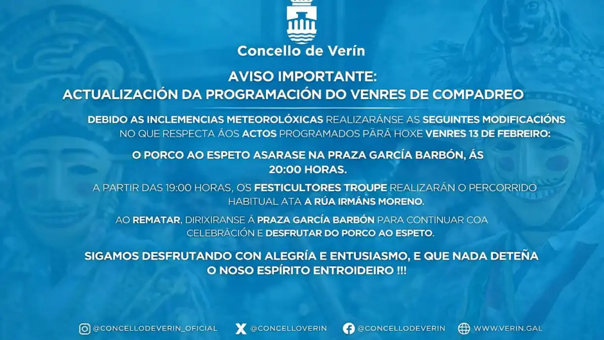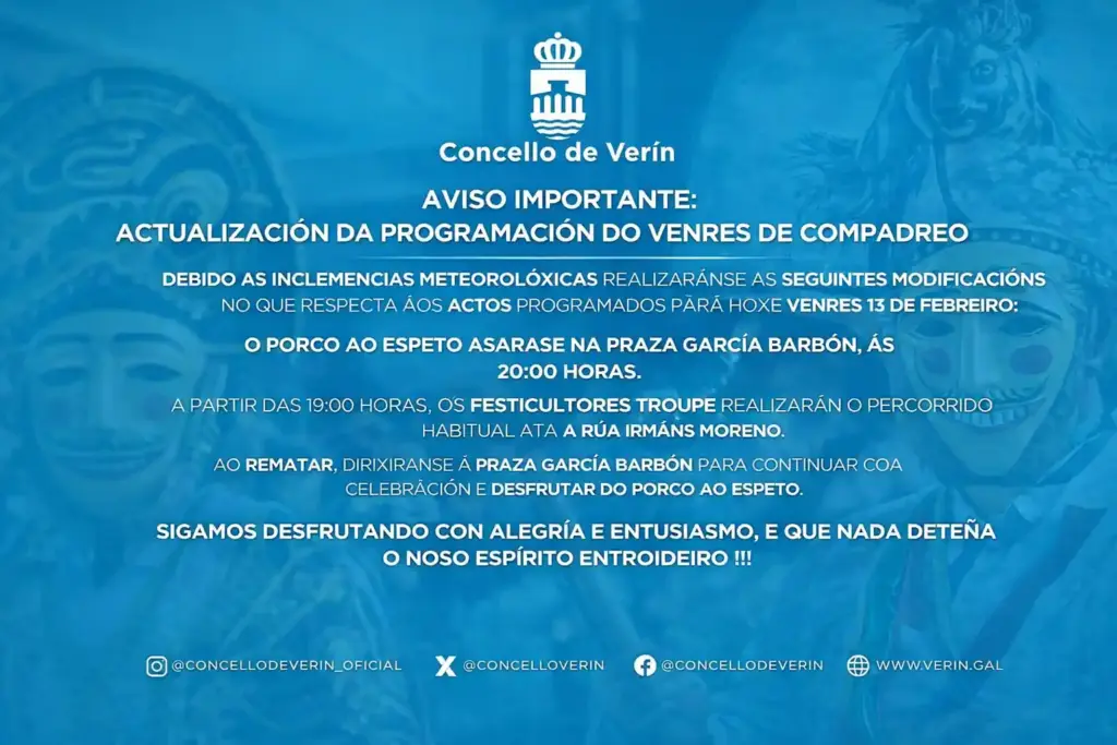 O Concello de Verín reforza a seguridade cidadá coa incorporación de dous vehículos híbridos para a Policía Local11/02/2026 13/02/2026 Categorías Concello Entroido Turismo Etiquetas Share Novas relacionadas11/02/2026O Concello de Verín reforza a seguridade cidadá coa incorporación de dous vehículos híbridos para a Policía LocalLer máis10/02/2026O Concello de Verín abre o prazo para participar na Feira do Lázaro 2026, do 20 ao 22 de marzoLer máis06/02/2026🎭 𝙀𝙉𝙏𝙍𝙊𝙄𝘿𝙊 𝘿𝙀 𝙑𝙀𝙍𝙄́𝙉 2026 · 𝙄𝙉𝙁𝙊𝙍𝙈𝘼𝘾𝙄𝙊́𝙉: 𝙎𝘼́𝘽𝘼𝘿𝙊 𝘿𝙊 𝘾𝘼𝙋𝙐𝘾𝙃𝙊́𝙉 🎭Ler máis