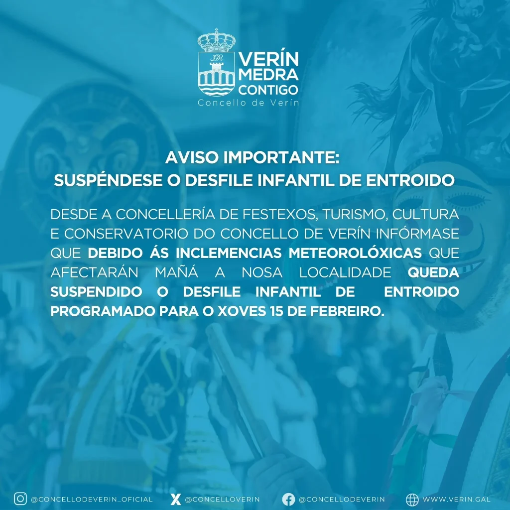 Aviso importante «Cambio de ubicación do Bautizo de Cigarrón»10/02/2024O Concello de Verín presentará as iniciativas para mellorar a xestión dos biorresiduos16/02/2024 14/02/2024 Categorías Cultura Entroido Festexos Turismo Etiquetas Share Novas relacionadas29/01/2026O Xantar do Capuchón converterá o sábado 7 de febreiro nunha xornada de convivencia, gastronomía e “Entroido de día” en VerínLer máis26/01/2026O Entroido de Verín 2026 reforza a “festa de día” coa estrea do Xantar do Capuchón e superará as 165 horas de música en directo Ler máis20/01/2026Aberto o prazo de inscrición de carrozas e comparsas para o Entroido de Verín 2026Ler máis