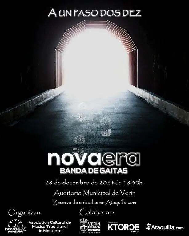 O sábado, 28 de decembro, ás 18:30 horas, o Auditorio Municipal de Verín volverá vibrar co tradicional concerto de Nadal da Banda de Gaitas Nova Era. Este ano, baixo o título «A un paso dos dez», a banda quere compartir con co público un adianto das celebracións polo seu décimo aniversario.