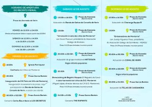 O venres 11, a partir das 20:00 horas, a Banda de Gaitas do Concello de Verín amenizará o acto inaugural oficial coa súa música en directo. Xa pola noite, ás 00:00 do sábado 12, será o turno da banda tributo a Los Secretos, o mítico grupo de pop-rock español, que fará vibrar ao público coas súas cancións máis emblemáticas.