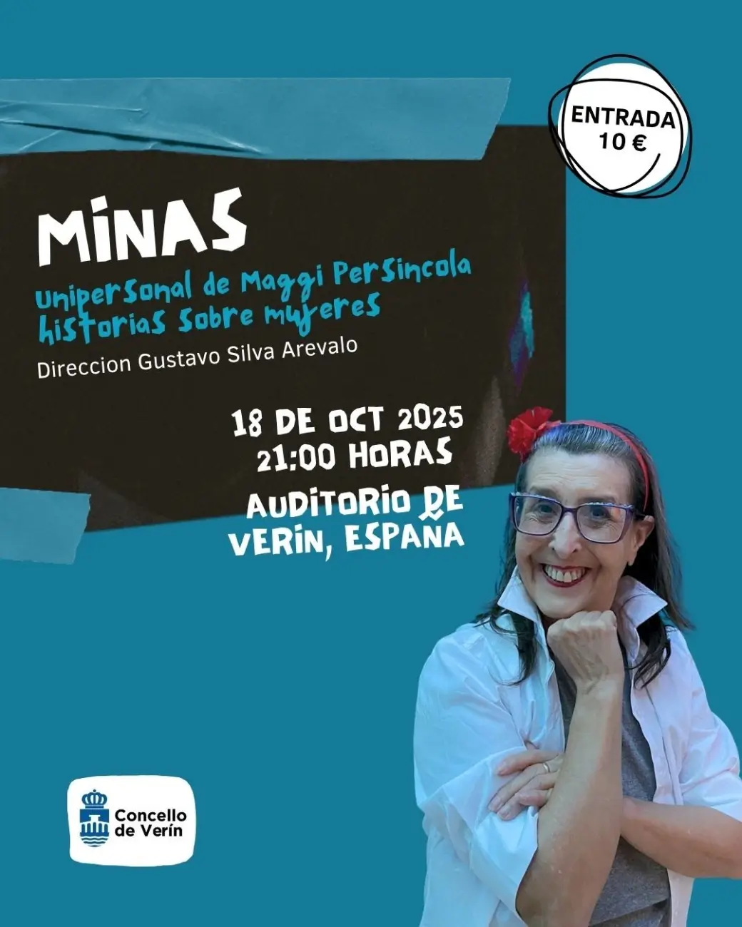 O Auditorio Municipal de Verín acollerá esta fin de semana dúas propostas teatrais de alto nivel da man da actriz e dramaturga arxentina Maggi Persíncola, que presentará os seus espectáculos “Minas” e “Abanderada”, dúas pezas unipersoais que combinan emoción, humor e reflexión social.