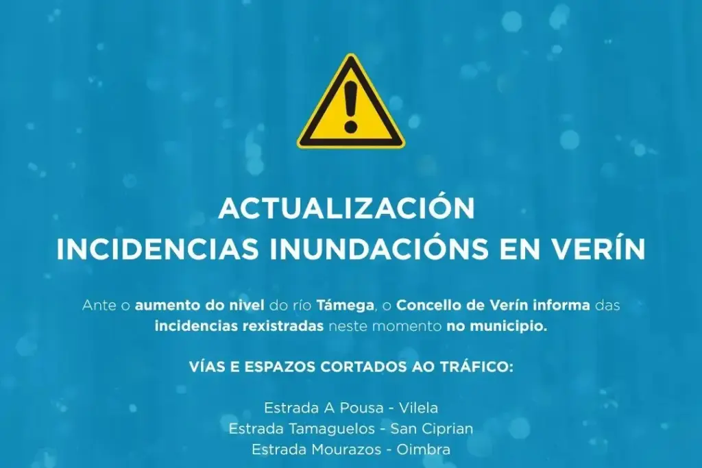 02/02/2026 02/02/2026Categorías Seguridade Cidadá e Protección Civilℹ️ 𝘼𝘾𝙏𝙐𝘼𝙇𝙄𝙕𝘼𝘾𝙄𝙊́𝙉 𝙄𝙉𝘾𝙄𝘿𝙀𝙉𝘾𝙄𝘼𝙎 · 𝙄𝙉𝙐𝙉𝘿𝘼𝘾𝙄𝙊́𝙉𝙎 /03/02/202603/02/2026 Ante o aumento do nivel do río Támega, o Concello de Verín informa das incidencias rexistradas neste momento no […]