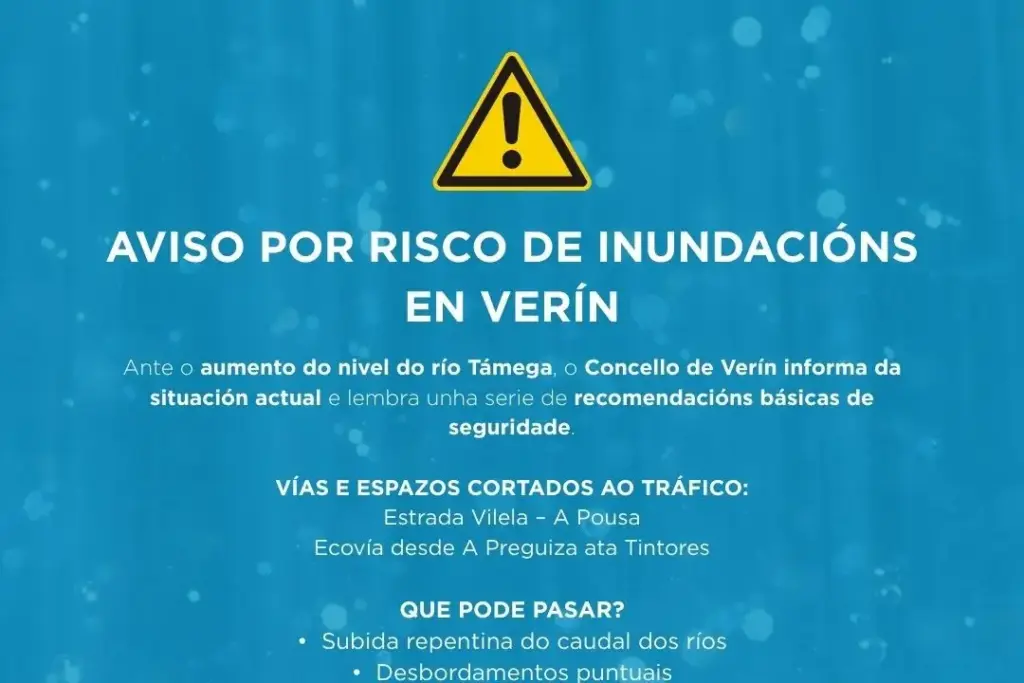02/02/2026 02/02/2026Categorías Seguridade Cidadá e Protección Civil⚠️ 𝘼𝙑𝙄𝙎𝙊 𝙋𝙊𝙍 𝙍𝙄𝙎𝘾𝙊 𝘿𝙀 𝙄𝙉𝙐𝙉𝘿𝘼𝘾𝙄𝙊́𝙉𝙎 𝙀𝙉 𝙑𝙀𝙍𝙄́𝙉 ⚠️Ante o aumento do nivel dos ríos, o Concello de Verín informa da situación actual e lembra unha serie de […]