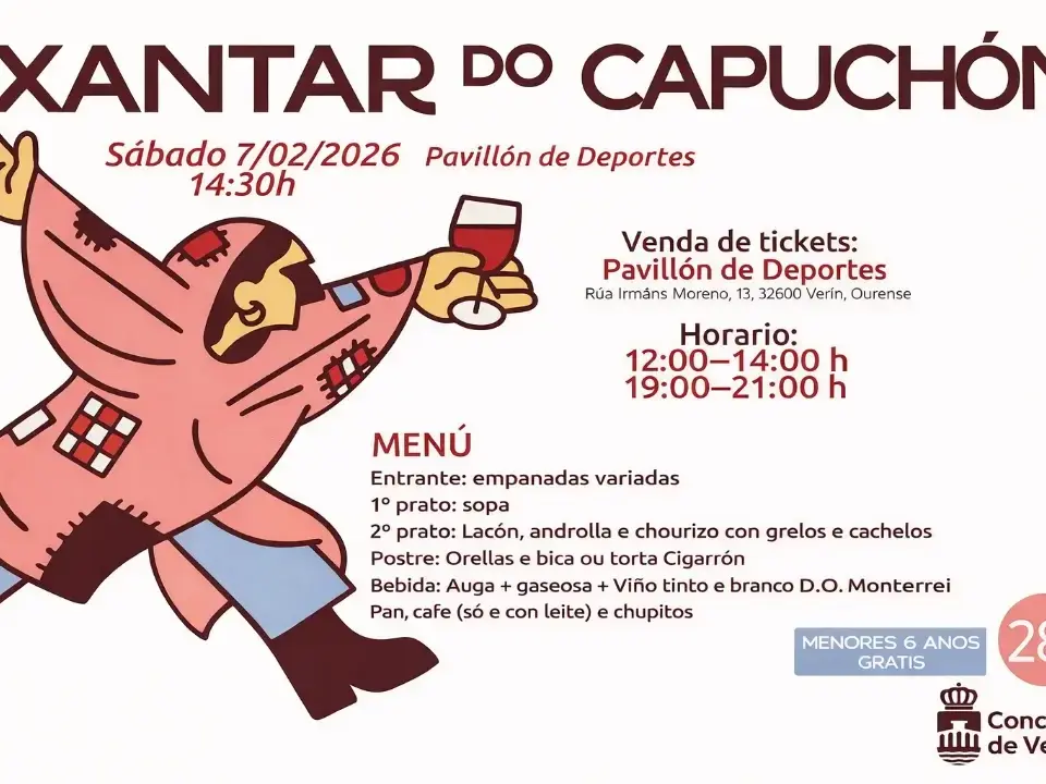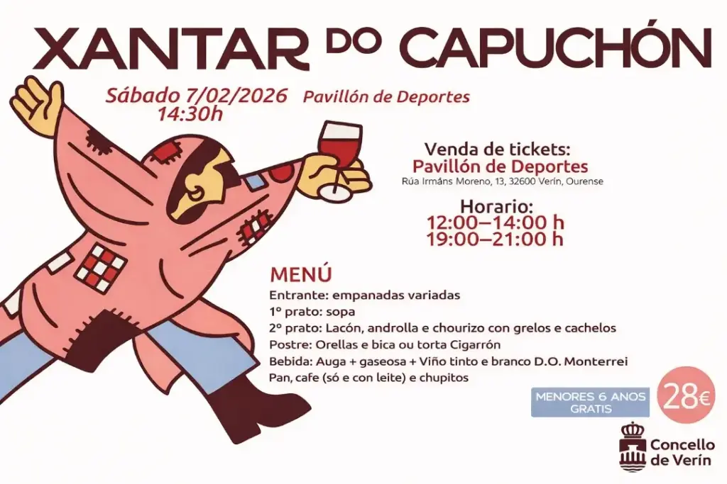29/01/2026 29/01/2026Categorías Cultura EntroidoO Xantar do Capuchón converterá o sábado 7 de febreiro nunha xornada de convivencia, gastronomía e “Entroido de día” en VerínAs entradas pódense adquirir no Pavillón Municipal de Deportes, en horario de 12:00 a 14:00 horas e de 19:00 a […]
