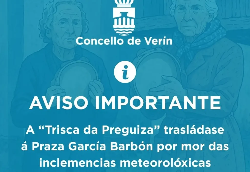 08/05/2025 08/05/2025Categorías Urbanismo e VivendaA “Trisca da Preguiza” trasládase á Praza García Barbón por mor das inclemencias meteorolóxicasVerín, 8 de maio de 2025. O Concello de Verín informa que, debido ás previsións meteorolóxicas adversas para este sábado, […]