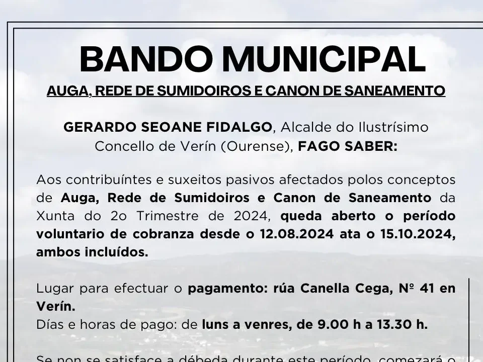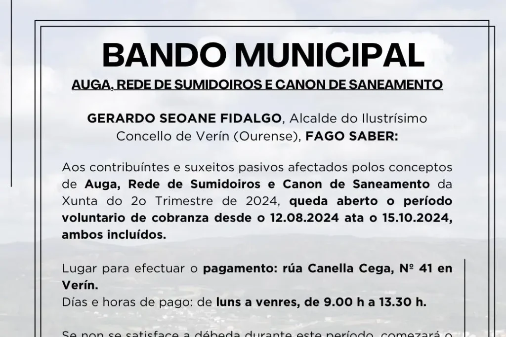 08/08/2024 08/08/2024Categorías ConcelloÁbrese o Período de Cobranza Voluntaria das taxas dos servizos Auga, rede de sumidoiros e Saneamento en VerínVerín, 8 de agosto de 2024. O Concello de Verín comunica aos contribuíntes e suxeitos pasivos afectados polos conceptos de […]