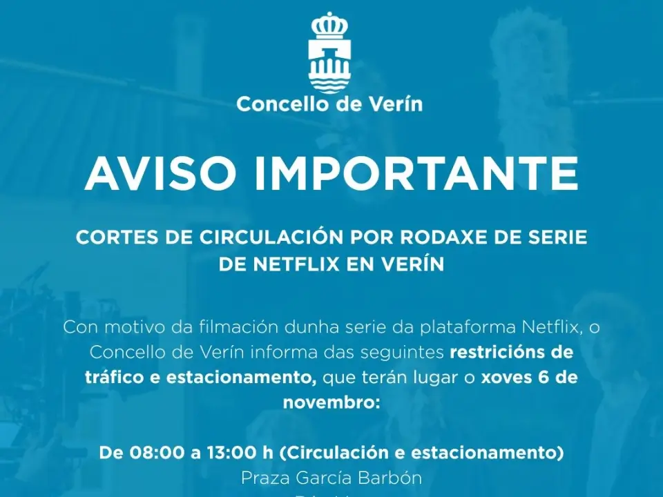 05/11/2025 05/11/2025Categorías Concello Seguridade Cidadá e Protección CivilCortes de circulación por rodaxe de serie de Netflix en VerínCon motivo da filmación dunha serie da plataforma Netflix, o Concello de Verín informa das seguintes restricións de tráfico e […]