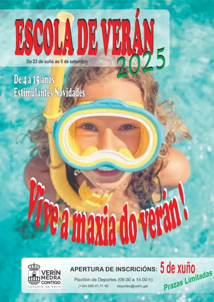 11/06/2025Verín, 4 de xuño de 2025. A Área de Deportes do Concello de Verín pon en marcha unha nova edición da Escola de Verán, unha das actividades máis agardadas polas familias verinesas. A XVI Escola de Verán desenvolverase do 23 de xuño ao 5 de setembro e está dirixida a nenos e nenas de entre 4 e 15 anos.