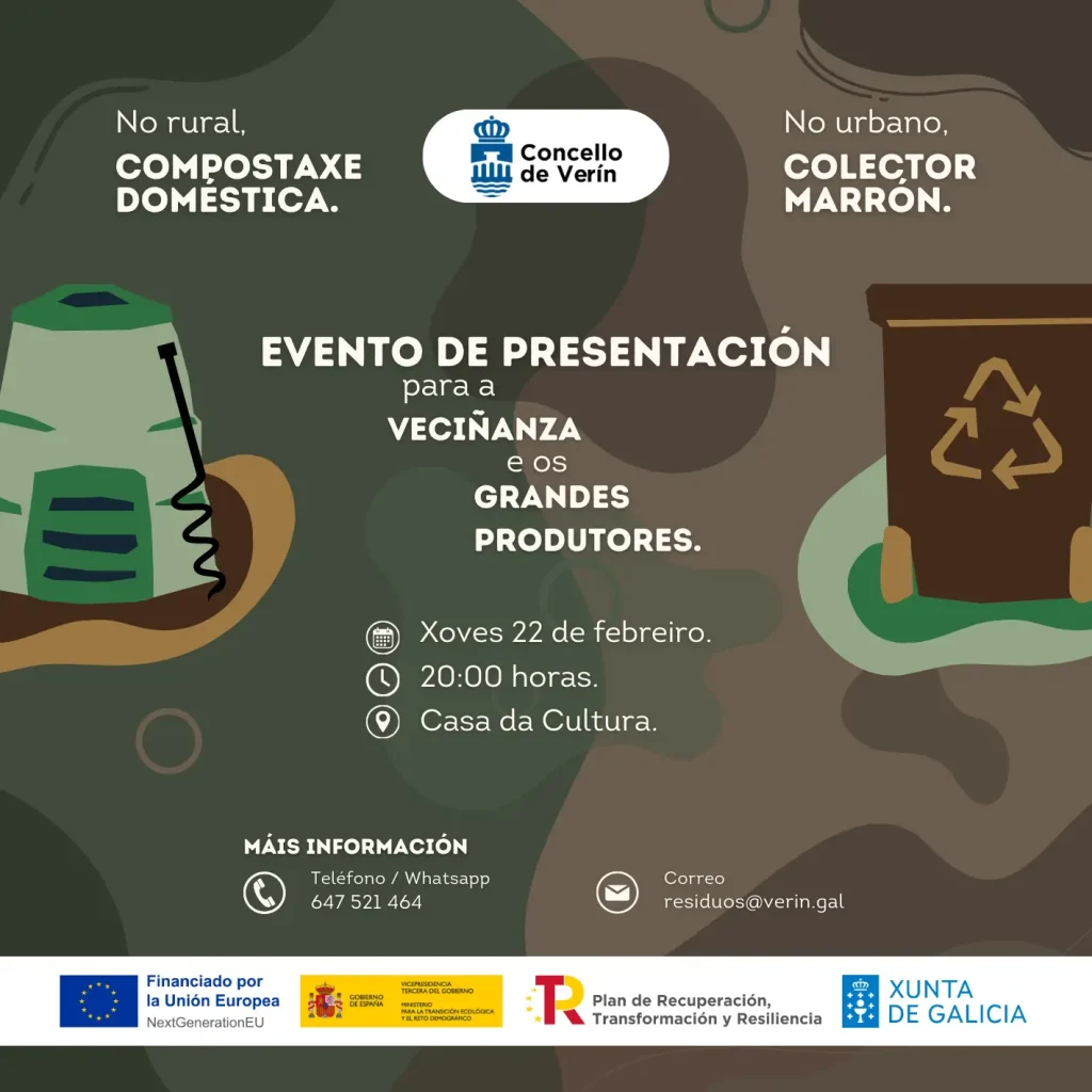 19/02/2024O xoves 22 de febreiro ás 20:00 horas, no Salón de Actos da Casa da Cultura, o Concello de Verín convida á veciñanza e ao tecido empresarial, en especial á hostalaría e grandes produtores de residuos orgánicos, a coñecer de primeira man os proxectos para mellorar a xestión dos biorresidous no municipio.