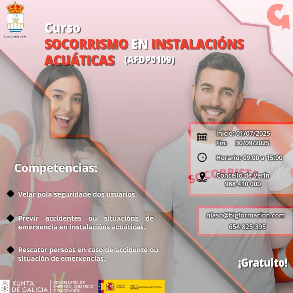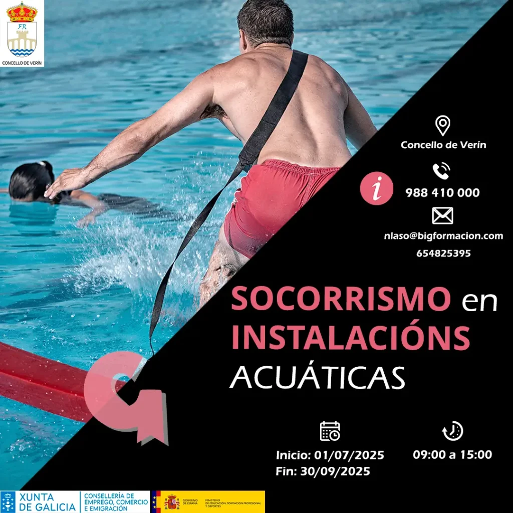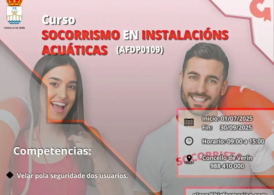 18/06/2025Verín, 17 de xuño de 2025. O Concello de Verín impartirá un curso oficial, gratuíto para desempregados, de socorrismo en instalacións acuáticas.O mesmo terá lugar desde o 1 de xullo ata o 30 de setembro, en horario de 9:00 a 15:00 horas.