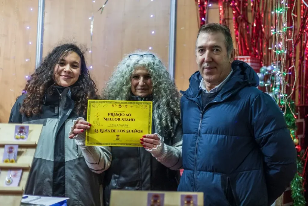 Sorteo da cesta de produtos premio a mellor standEste ano, a persoa premiada no tradicional sorteo celebrado o domingo na carpa de feira cunha cesta de produtos típicos de nadal cedida polos expositores foi Pilar Núñez Rojas (recolleu o premio a sua filla, Sonia Núnez) , e o premio a mellor stand foi outorgado a La luna de los sueños (Yolanda Hernández Marco e Beatriz Cándido Carrasco).