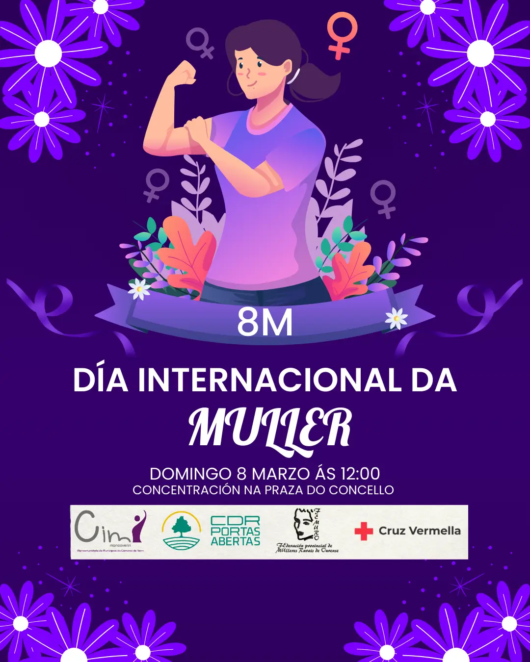 O Centro de Información á Muller (C.I.M.) da Mancomunidade de Verín organiza, en colaboración co CDR Portas Abertas, Cruz Vermella e Femuro o acto público con motivo do 8 de marzo, Día Internacional das Mulleres, que terá lugar o vindeiro domingo 8 de marzo ás 12:00 horas fronte ao Concello de Verín.