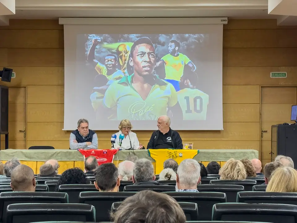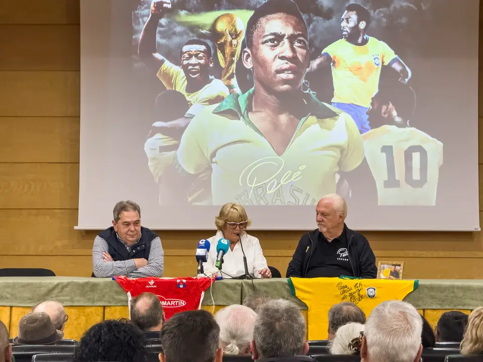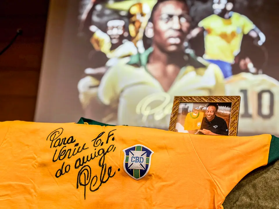 Verín, 25 de outubro de 2025. O Concello de Verín acolleu este venres, 24 de outubro, no Salón de Actos da Casa da Cultura, un acto histórico de recoñecemento a Edson Arantes do Nascimento “Pelé”, o considerado mellor futbolista de todos os tempos. Durante o evento, José “Pepito” Fornos —mánager e home de confianza do astro brasileiro durante máis de cincuenta anos— fixo entrega ao Verín F.C. da camisola oficial da Selección Brasileira asinada e adicada polo propio Pelé, un agasallo cargado de simbolismo que representa a unión entre o “rei do fútbol”, o deporte galego e a vila de Verín.